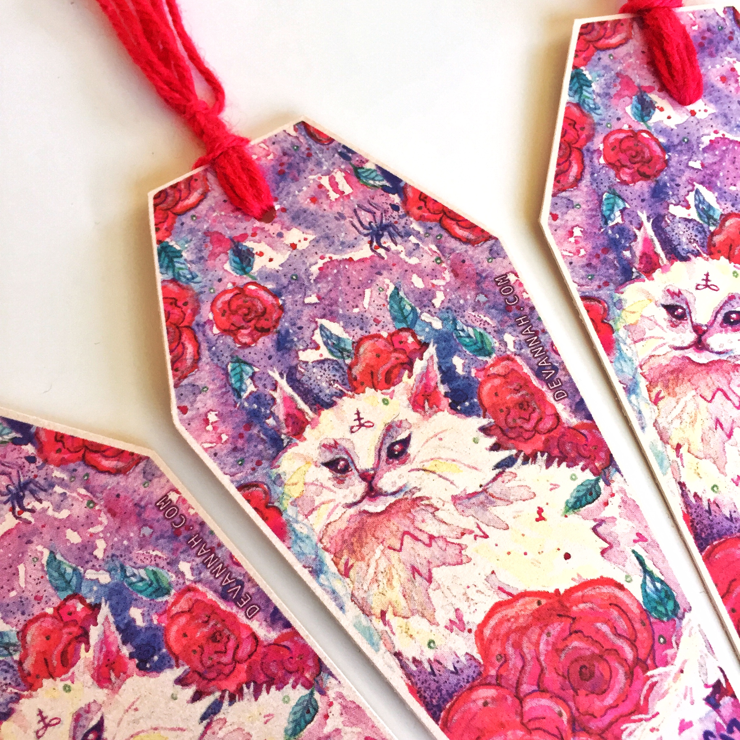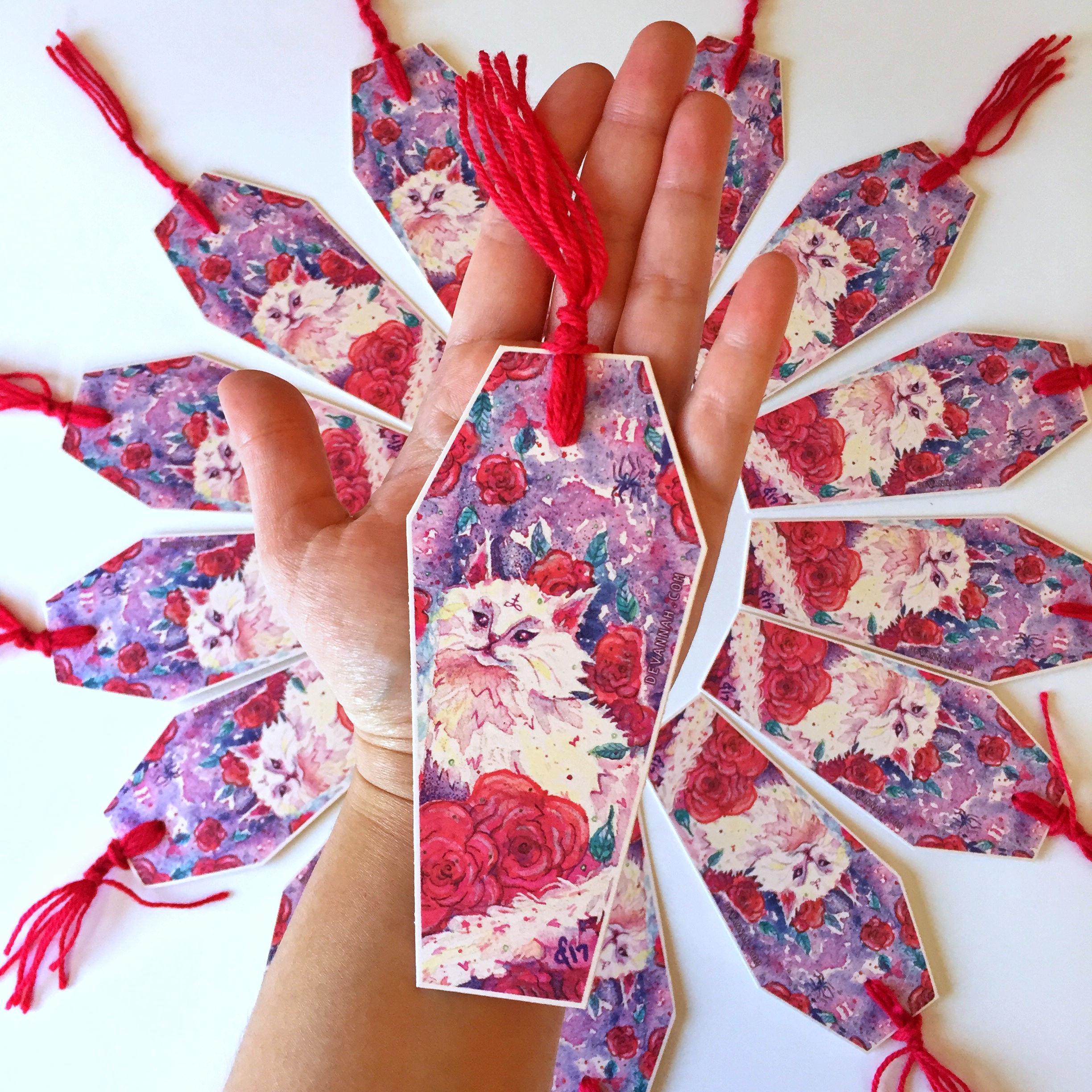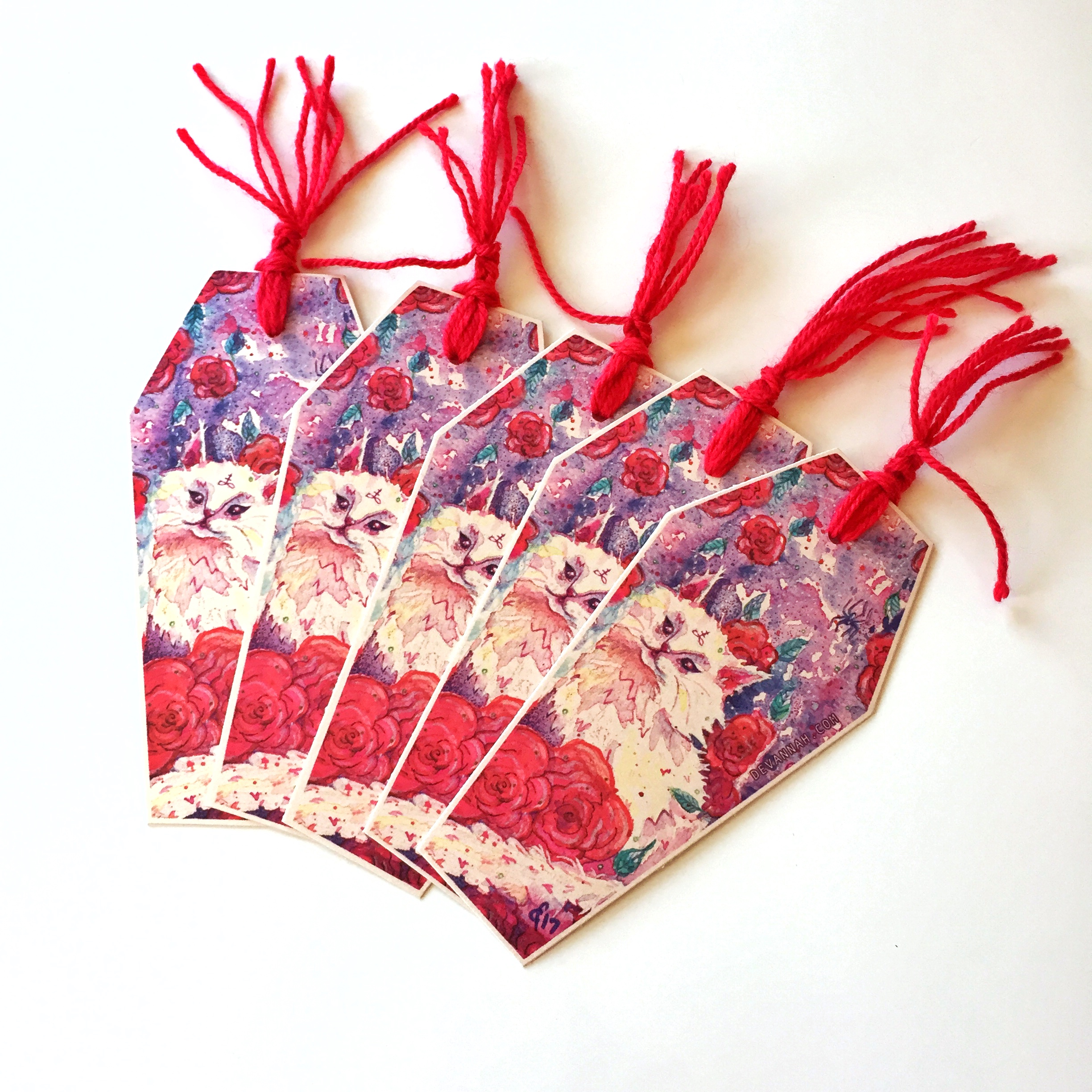 Handmade Bookmarks featuring a fluffy kitty. Printed on pearl finish glitter paper.
